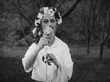 B/W 1920s man with flower wreath on head (Ben Turpin) picking flower + smelling it / feature - stock video