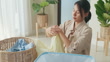 Beautiful young Asian woman doing laundry at home. Activity of daily living at house concept.