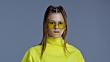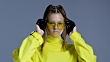 Blond high fashion model in bright stage make-up, wearing yellow sunglasses and black leather gloves, touches her hair and sunglasses. Fashion Video. Slow Motion. 4K 30fps ProRes 4444