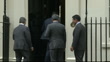 Chancellor George Osborne meets Warner Bros Executives; ENGLAND: London: Downing Street:EXTGeorge Osborne MP (Chancellor of the Exchequer) along Downing Street and into No 11 / Warner Bros executives along Downing Street / Osborne out of No.11 / handshakes / Osborne poses with Barry Meyer (Warner Bros Chairman), Kevin Tsujihara (Warner Bros CEO) and Josh Berger (President and Managing Director, Warner Bros, Ireland and Spain) / all enter building