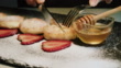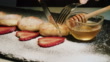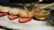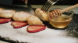 Cheesecakes with strawberries and honey sprinkled with powdered sugar on a dark slate board. Close-up shot.. - 4K stock video