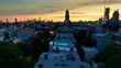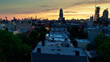 Aerial view of New York City from over Greenpoint, Brooklyn at sunset, descending over a row of houses with new development on the banks of the East River and the Lower Manhattan skyline in the distance.