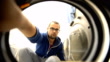Young Caucasian man putting dirty laundry in washing machine.
