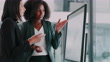 4k video footage of two businesswomen using an interactive whiteboard to analyse data in an office