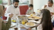 Slow motion view of Middle Eastern children sitting at family dining table with parents and grandparents, enjoying holiday specialties.