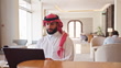 A medium shot captures a mid adult Arabic businessman intensely working on a laptop in a hotel lobby. Dressed in traditional attire, he utilizes modern technology amidst a professional, serene environment, reflecting a blend of tradition and modernity.