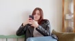 Girl texting on her smartphone while at home sitting on a couch, with natural light coming in behind her