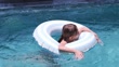 Happy blond girl having fun with inflatable ring in clear blue swimming pool. Outdoor summer recreation. - 4K stock video
