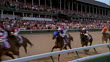 Jockeys on racehorses ride away from stalls and gallop down Churchill Downs racetrack, Louisville, Kentucky Available in HD.