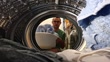 Handsome mid adult man putting laundry in a washing machine. Camera's point of view.