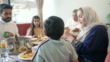 Young brother and sister sitting at dining table with parents and grandparents, enjoying traditional meal, fruit juice, and conversation.