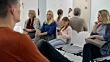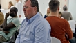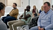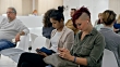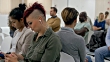 Wide dolly shot of people waiting in a large waiting room in the hospital. Shot in Slovenia.