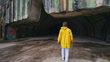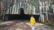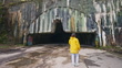 SLO MO Rear View of Young Female Tourist Walking Towards Abandoned Underground Zeljava Air Base in Croatia - 4K stock video