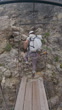 Determined climber conquering a rocky mountain face. Adventurer ascending a steep trail secured with ropes. Outdoor enthusiast exploring extreme terrains.