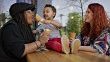 A homosexual biracial female couple takes their son out for ice cream. The Son give his mother a taste of his cone. One woman is Caucasian and the other is African-American