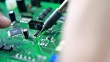 Close-up of hands soldering a component onto a circuit board.