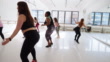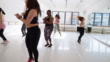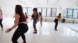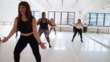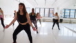 Woman practicing vigorous swing during group training in dance studio. Group of women doing fitness dance workout in stusio.