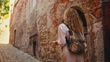 This mesmerizing video showcases the rear view of a young woman with curly blonde hair and a backpack walking on a narrow street amidst the weathered building walls of Ptuj's old town. The rhythmic sound of her footsteps on the cobbles create an endearing ambiance while the camera follows her along the winding streets, capturing the fascinating architecture and textures of the weathered buildings. Shot in a bird's-eye view, the video captures the essence of Ptuj's old-world charm, with the woman's figure providing a captivating point of reference. This video inspires viewers to reflect on the history and legacy of the places they encounter in their travels while admiring the beauty that lies in the details.