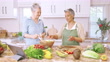 Women standing in the kitchen talking and making a salad - 4K stock video